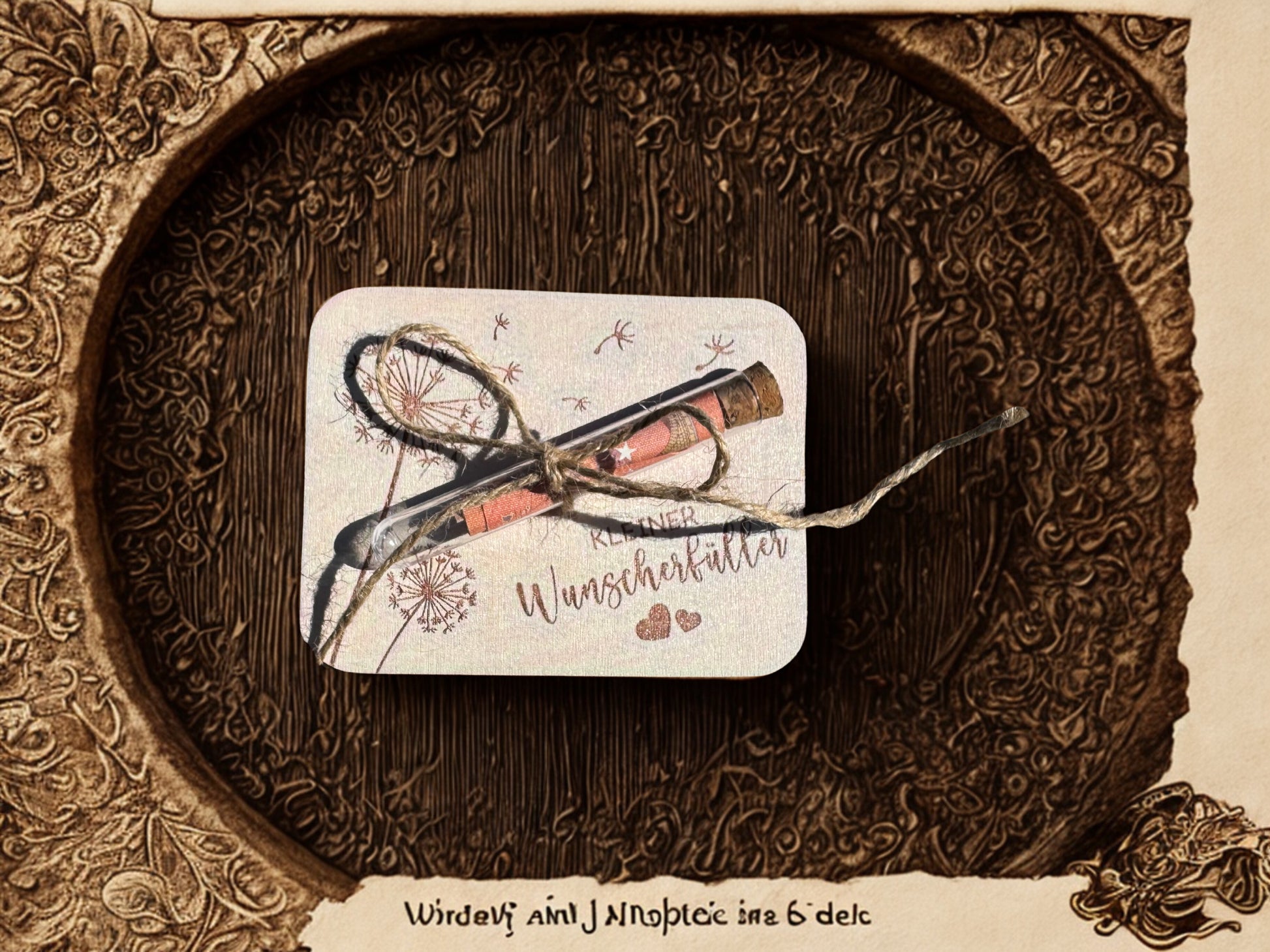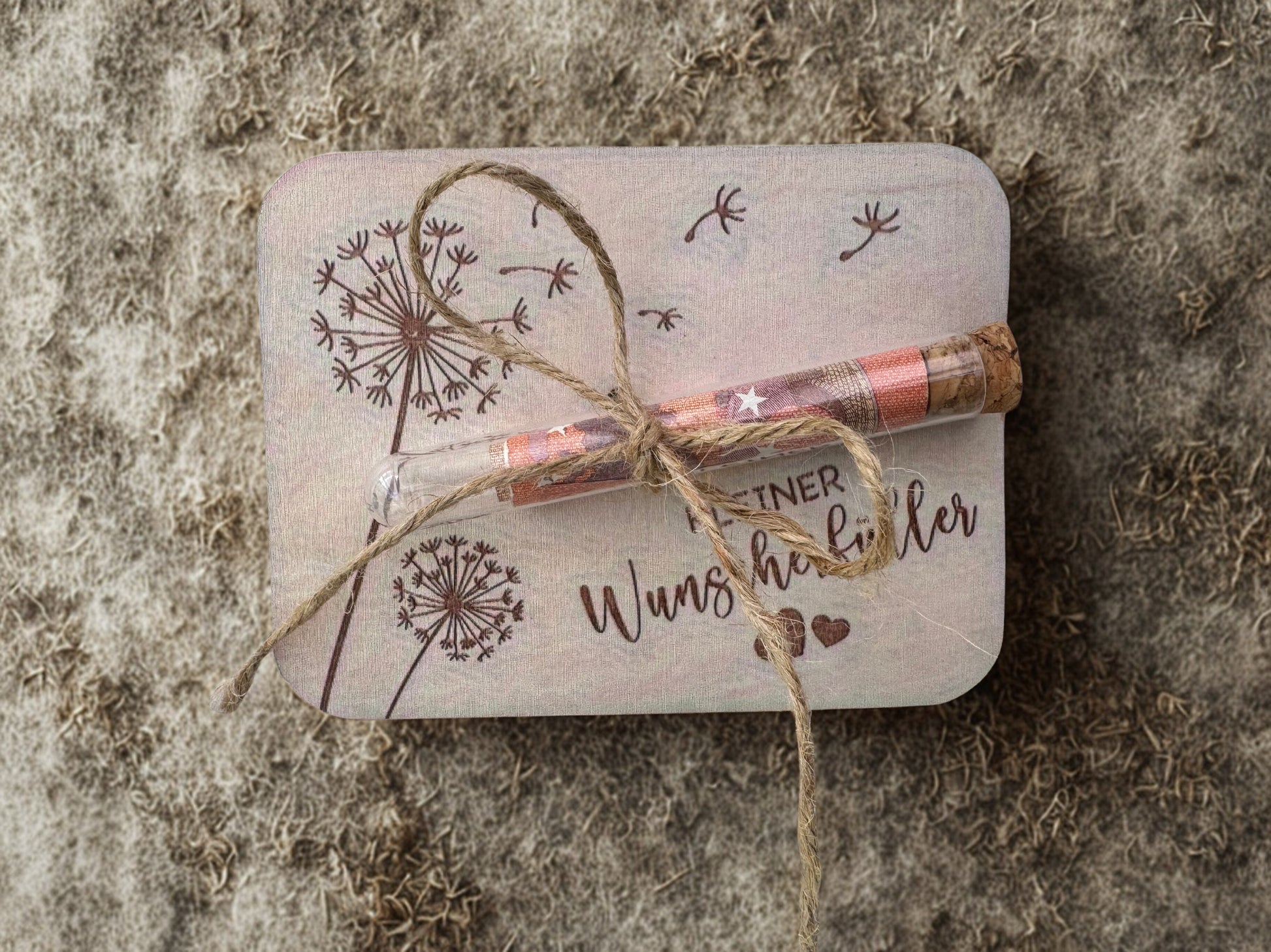 Manchmal sind es die kleinen Dinge, die große Freude bringen. Unser kleiner Wunscherfüller ist ein liebevoll gestaltetes Holzschild mit einem Reagenzglas, perfekt um Geld, Glücksbringer oder kleine Botschaften zu verschenken.