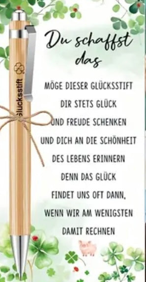 Manchmal reicht ein Wort, um wieder an sich zu glauben. Der Glücks- Stift ist mehr als nur ein Kugelschreiber – er ist ein täglicher Begleiter voller Zuversicht. Mit seinem sanften Schreibfluss liegt er angenehm in der Hand und erinnert dich bei jedem Wort daran: Du schaffst das!